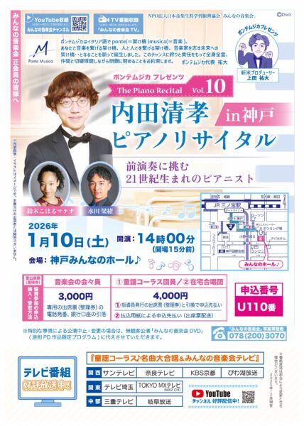 2025年11月1日(土)午後2時00分開演、神戸みんなのホールにおきまして、みんなの音楽会「The Piano Recital Vol.9 」が行われました。 題して、「高木伸弥 旅立ちのピアノリサイタル」です!