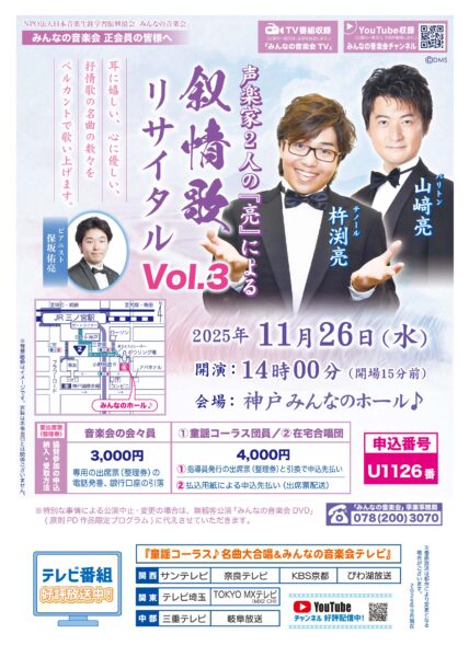 2025年11月8日(土)14時00分開演、神戸みんなのホールのおきまして、みんなの音楽会「松本友経バリトンリサイタル」が行われました。ピアニストは保坂佑亮、ソプラノ歌手畑村瞳をゲストに迎えての演奏会となり、オペラ名場面の二重唱を披露しました。岡山県は倉敷のお寺の四男坊、オペラ歌手ならぬオテラ歌手が、支持者の皆さんから熱き声援、拍手喝采で大盛況となりました。