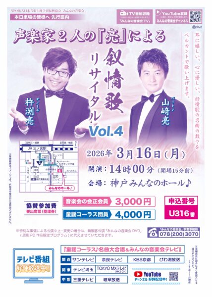 2025年11月26日(水)午後、神戸みんなのホールにおいて、山﨑 亮(バリトン)、杵渕 亮(テノール)の 声楽家2人の『亮』による「叙情歌リサイタル Vol.3」が行われました。本公演は5ケ月ぶりの第3回となるシリーズ化が期待されたリサイタルです。ピアニスト🎹は、ブルガリア留学7年の帰国子女?ピアノ博士、保坂佑亮です。