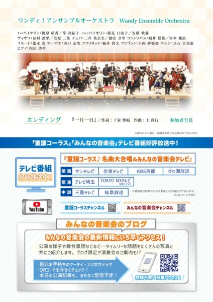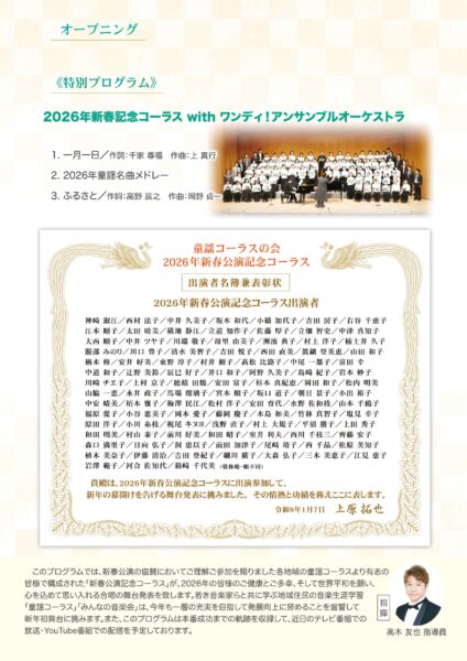 各地区の童謡コーラスの有志の皆様による「新春公演2026記念コーラス」が、ワンディ!ピアノ管弦楽アンサンブルの共演により、5つの童謡名曲の大合唱で2026年の歌い初めを果たしました。