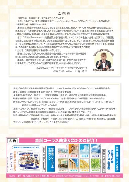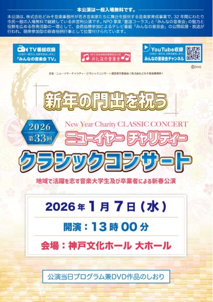 2026年1月7日(火)13時30分開演、神戸文化ホール大ホールにおきまして、「第33回新春公演New Year Charity Classic Concert 2026」