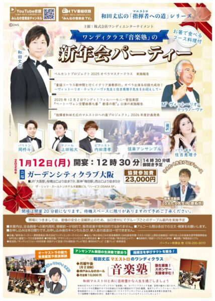 2026年1月12日月曜日「成人の日」の午後、ガーデンシティクラブ大阪(ハービスPLAZA ENTビル6階)において、我らがマエストロ、ワンディこと和田丈広の音楽塾「ワンデイクラス」の2026年新年会パーティーが開催されました。