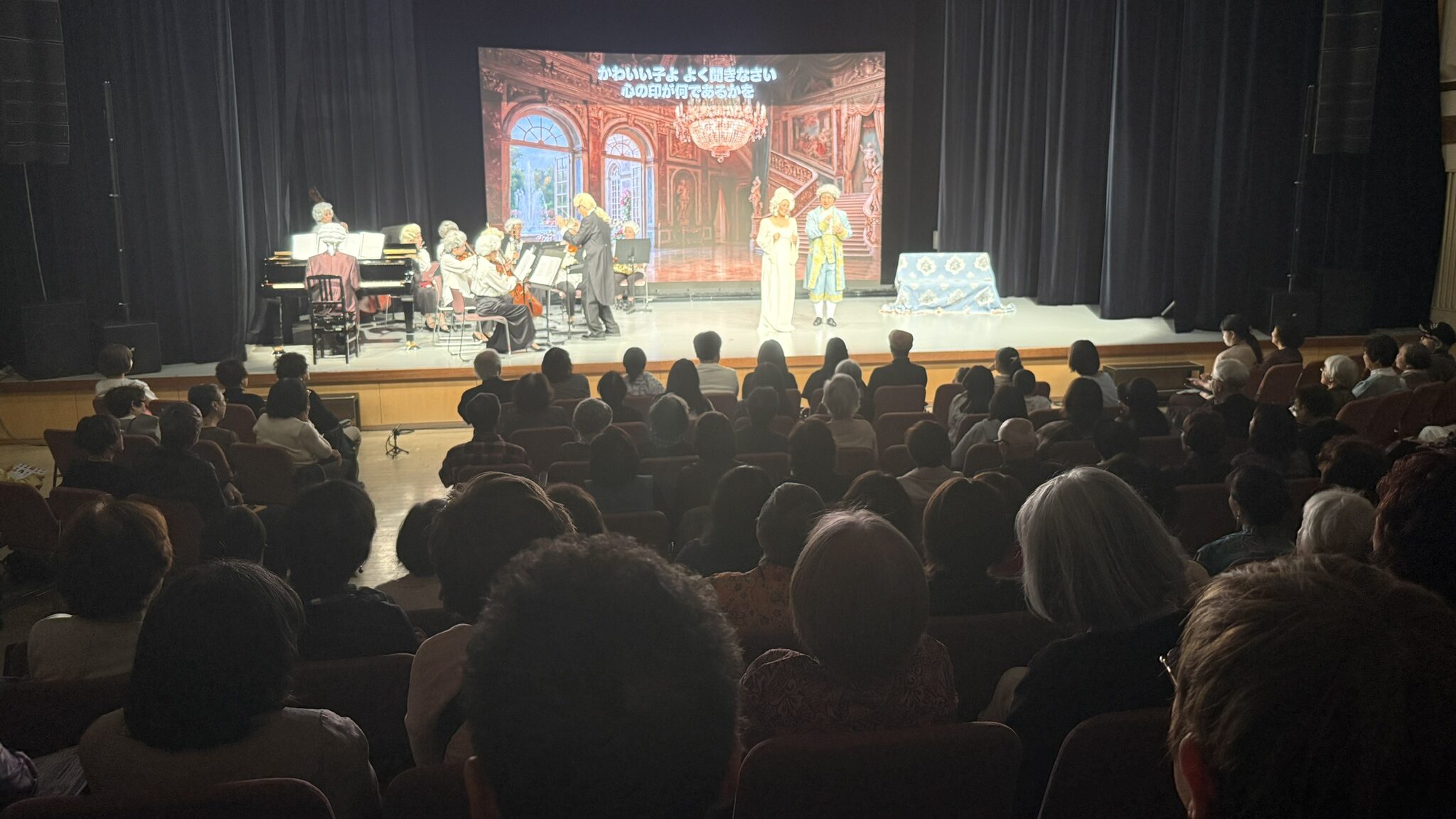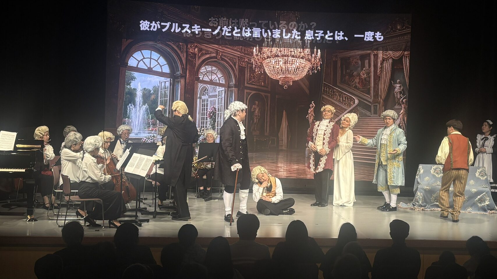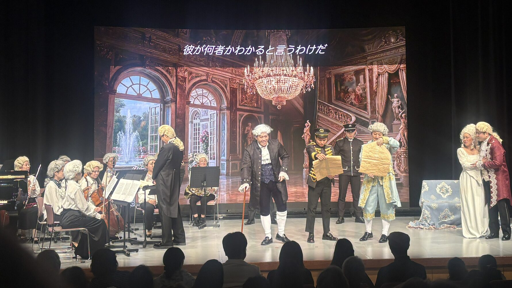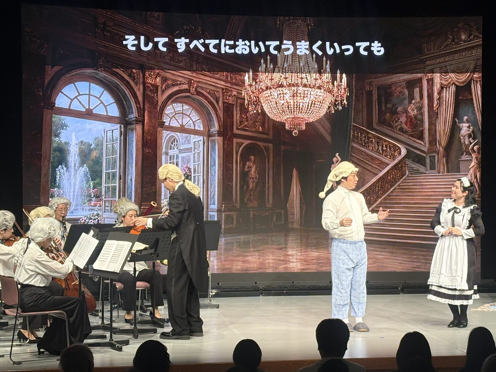 関東・関西・中部から沖縄に渡った団員の皆様、そして、初めて童謡コーラスに参加した沖縄の方々で会場内はいっぱい!今回はオーケストラの方々も役者の一人として、欧州貴族のようなかつらを被り、演奏をお届けしました。