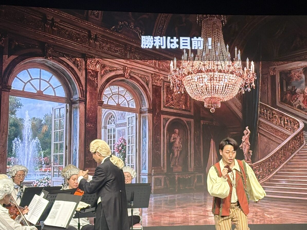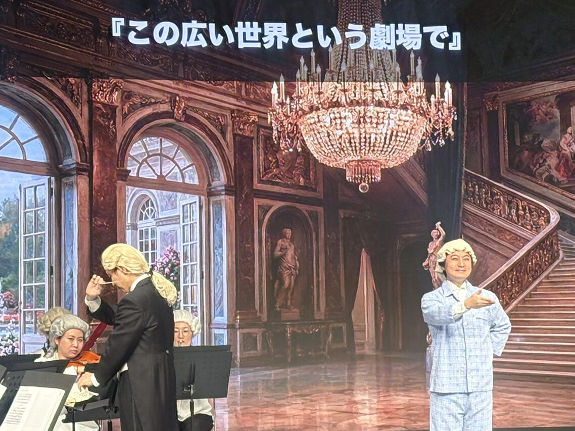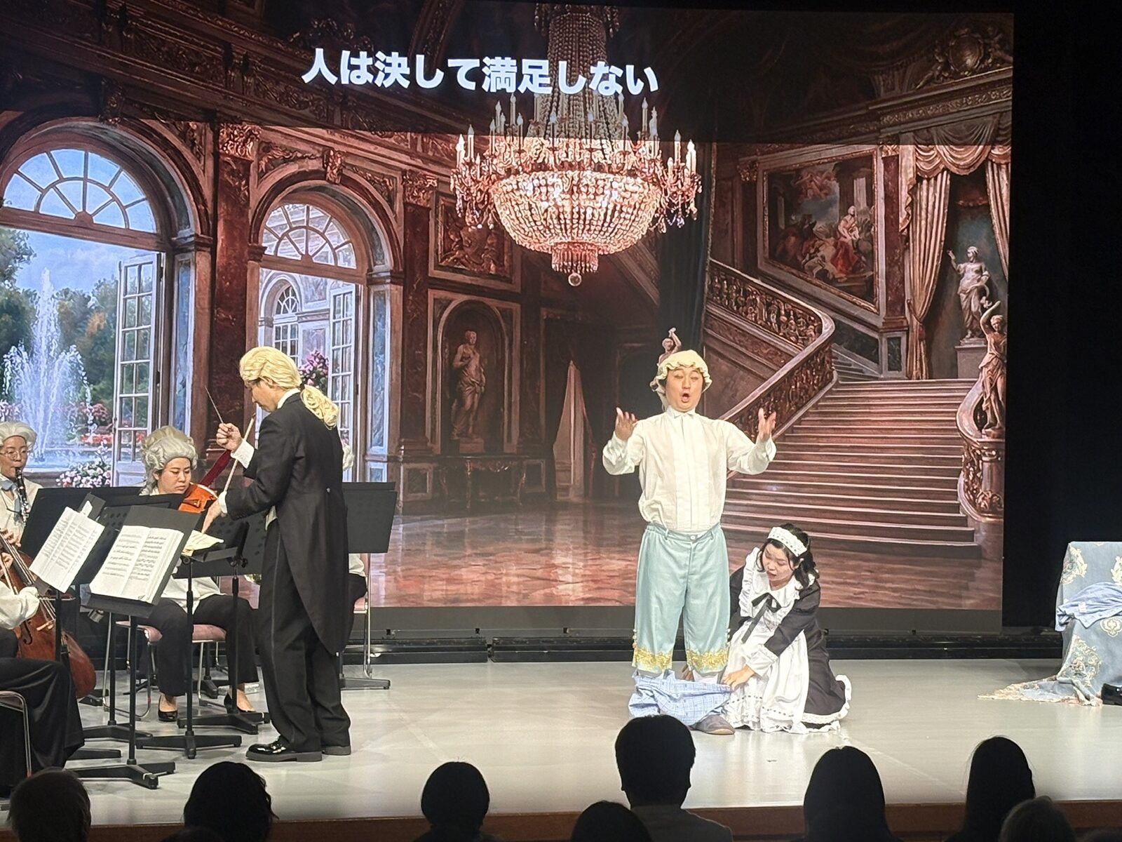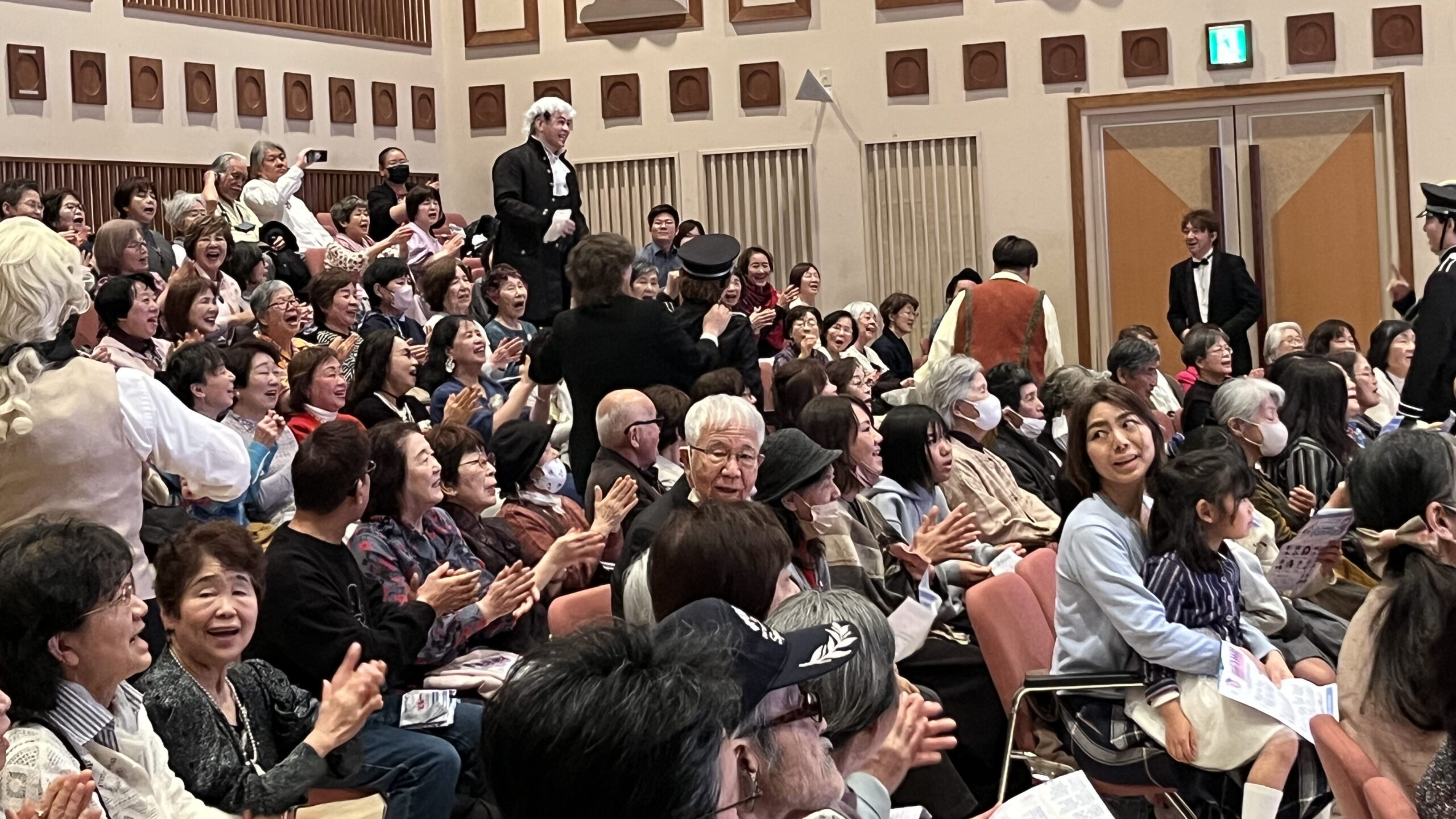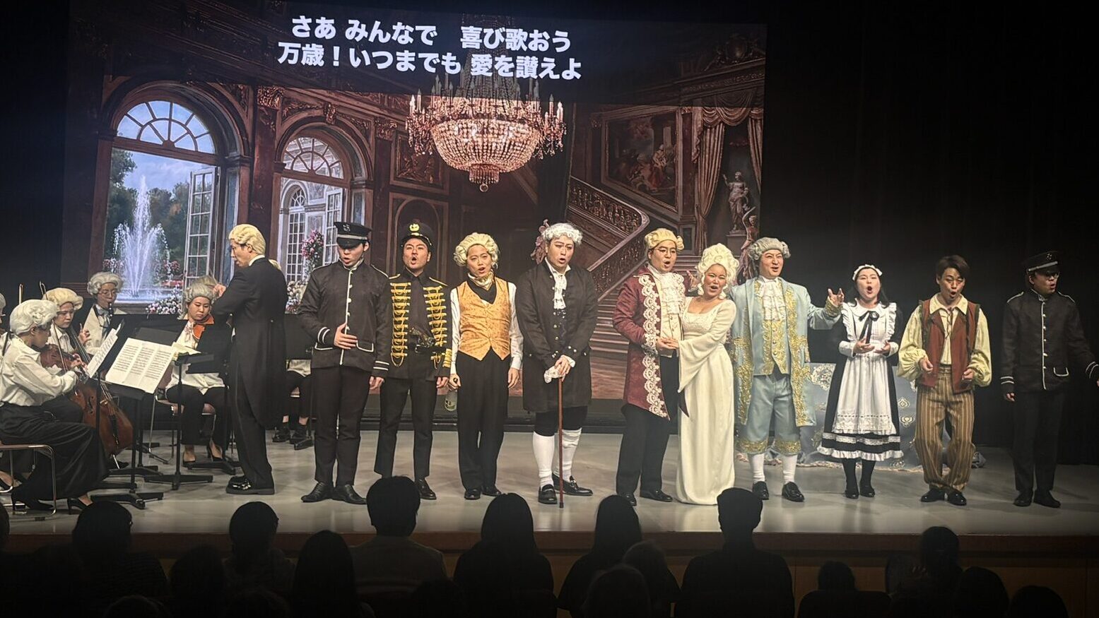 関東・関西・中部から沖縄に渡った団員の皆様、そして、初めて童謡コーラスに参加した沖縄の方々で会場内はいっぱい!今回はオーケストラの方々も役者の一人として、欧州貴族のようなかつらを被り、演奏をお届けしました。
