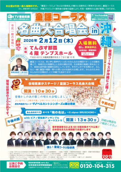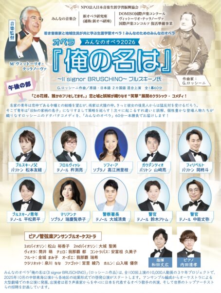 2026年2月12日(木)午後、沖縄は那覇てんぶすホール(那覇国際通り)において、みんなのオペラ「俺の名は(Il signor BRUSCHINO)」の17回目公演が上演され、沖縄那覇市近隣の各地から地域の皆様が来場され、拍手喝采、ブラボーの歓声があがり大盛況となりました。