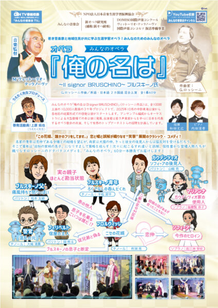 みんなのオペラ「俺の名は(il Sinyore Burusukino)」(ロッシーニ作品)は、全100回上演の10,000人動員の3ケ年プロジェクトで、関西各地ホール公演、中部東海公演を経て、今回の沖縄那覇公演の実現で、各地区の巡業形式での啓発公演が継続しています。神戸みんなのホールの10回連日上演でスタートした「みんなのオペラ」は、100名規模の小劇場での上演が中心で、上演回数をより多くすることで、若き声楽家らの研鑽・研究のチャンスを拡大することが目的です。さらにアンサンブル編成からオーケストラによる大型劇場での本公演に発展、出演者は若き声楽家らを中心に日本を代表するオペラ歌手の共演、そして世界のトップアーチストらの招聘を計画しています。