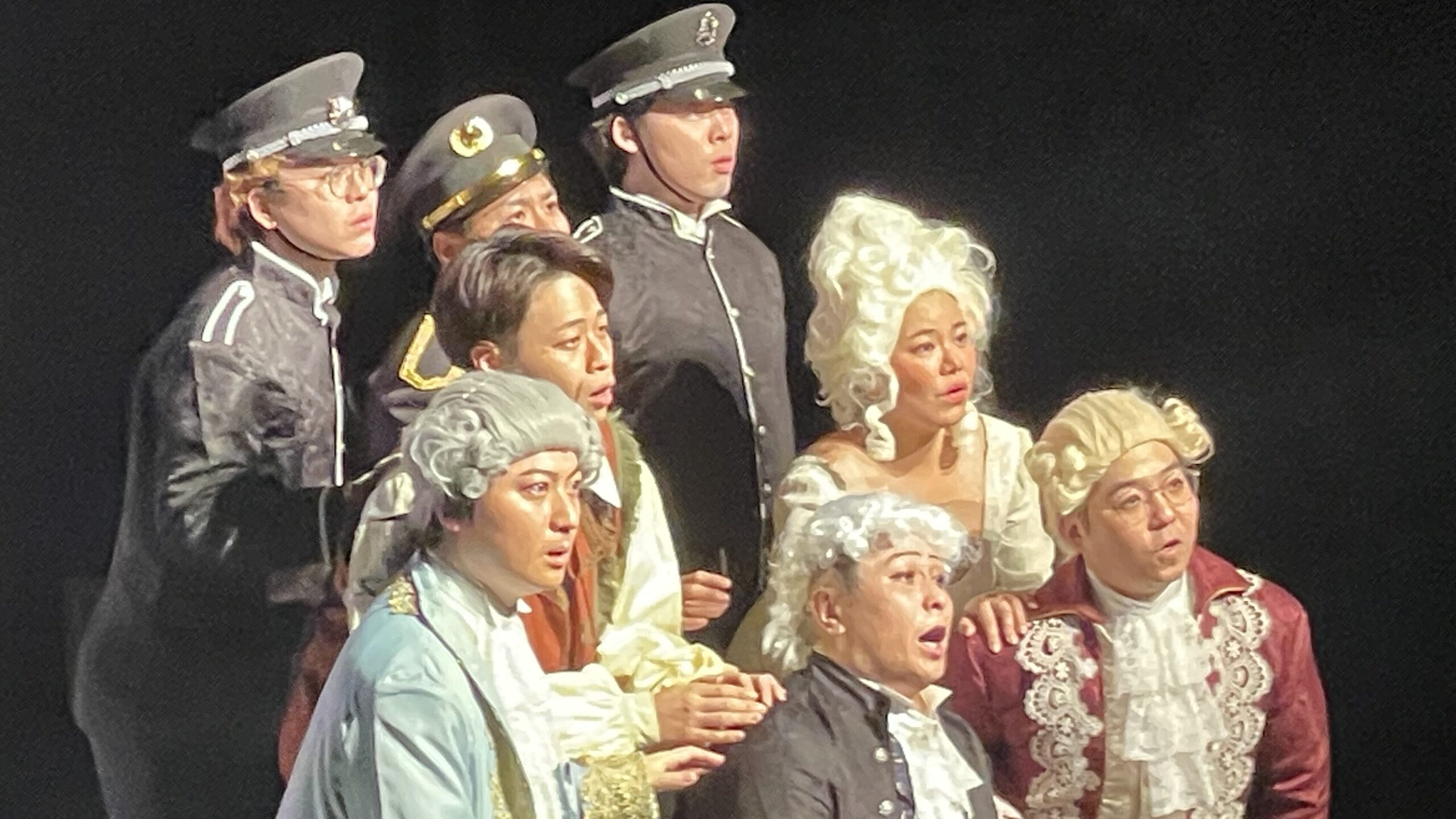 『俺の名は』の中でも、最も混乱の只中となる6重唱の場面。ブルスキーノの息子を名乗る男が、本物か偽物か。警察署長が現れて問いただします。今回は、警官役も2名衣装を着て登場し、場の華やかさも一段と増しました。