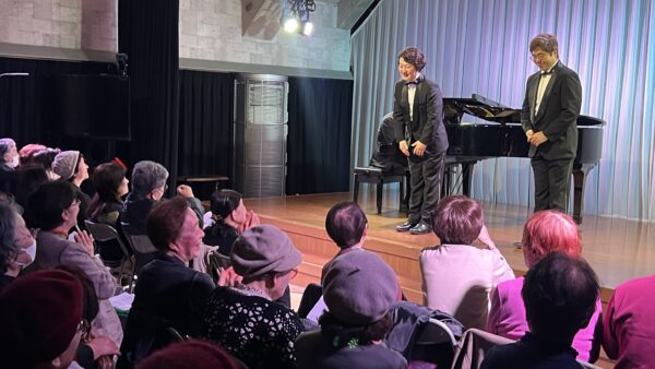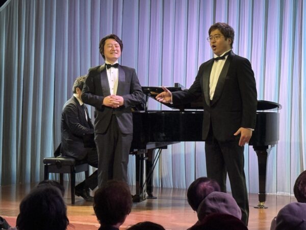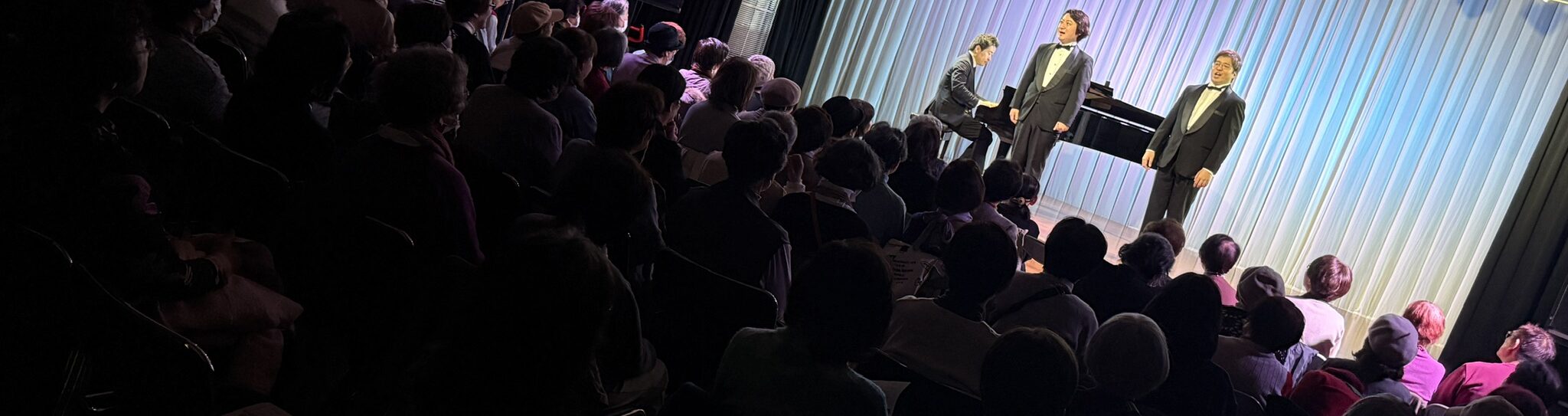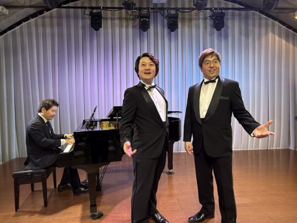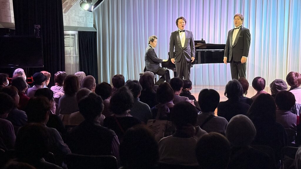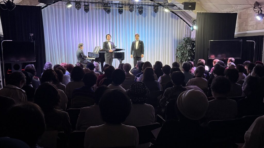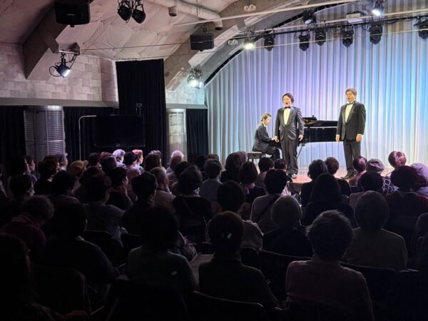 本公演は、昨年11月の公演から4か月ぶりとなる第4回で、シリーズとして定着しつつある、上拓先生推しの注目のリサイタルです。東京藝術大学の先輩・後輩でもある二人が、声楽の魅力と二重唱をテーマにプログラムを構成しました。みんなの音楽会の正会員の皆様をはじめ、各地区の童謡コーラスの支援者の皆様、そしてお二人の熱烈なファンの皆様、あわせて100名が来場されました。会場は拍手喝采で、「ブラーボ!」「ブラービ!」の大きな声援に包まれ、盛況のうちに幕を閉じました。合掌