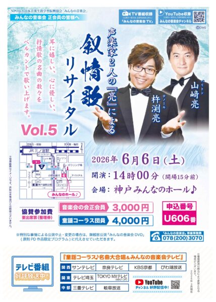 2026年3月16日(月)午後、神戸みんなのホールにおいて、山﨑 亮(バリトン)と杵渕 亮(テノール)による「声楽家2人の『亮』による叙情歌リサイタル Vol.4」(テレビ番組収録会)が開催されました。