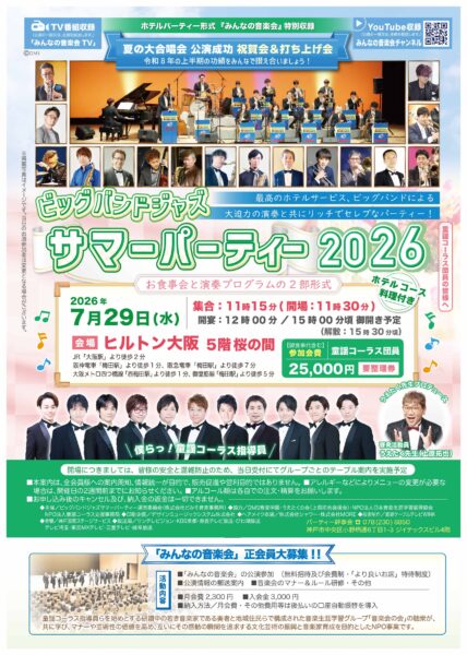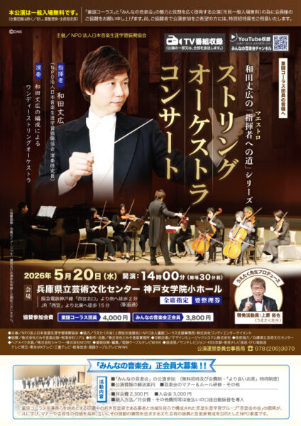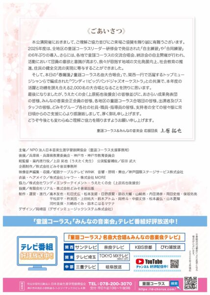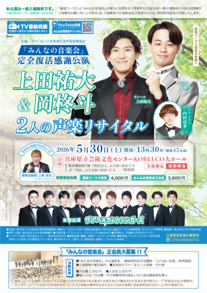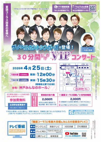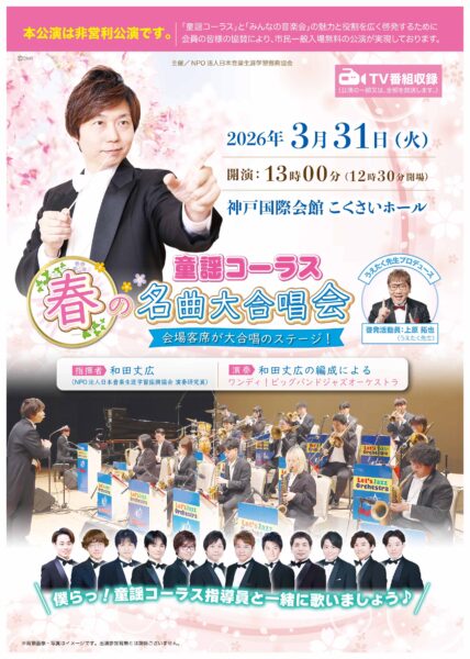 2026年3月31日(火)午後、、「童謡コーラス♪春の名曲大合唱会2026」が行われ、本年度の正に最終日、2025年度の活動の総決算!集大成として、1年間のご活躍とご功績を称える合唱会に続いて、特別プログラムでは、「みんなの音楽会2026年度ラインナップ」が発表され、神戸国際会館大ホールの満員御礼2,000名の来場者、支持者の皆様の拍手と歓声で大盛況となりました。