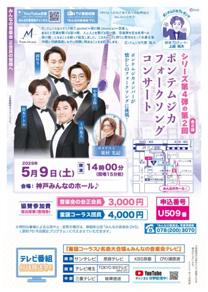 2026年4月11日(土)午後、神戸みんなのホールにおきまして、4年目の新米プロデューサーの祐大が挑む 「ポンテムジカ企画シリーズ第4弾」(第1回全8回)が開催されました。